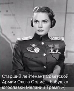 A propósito, os golpistas do tipo “foi a Rússia” nos EUA podem gostar desta foto da tenente Olga Orlif, do exército soviético – avó de Melania Trump que me foi enviada. Orlif foi uma combatente iugoslava lutando ao lado dos soviéticos contra a Alemanha nazista, dizem as fontes russas.